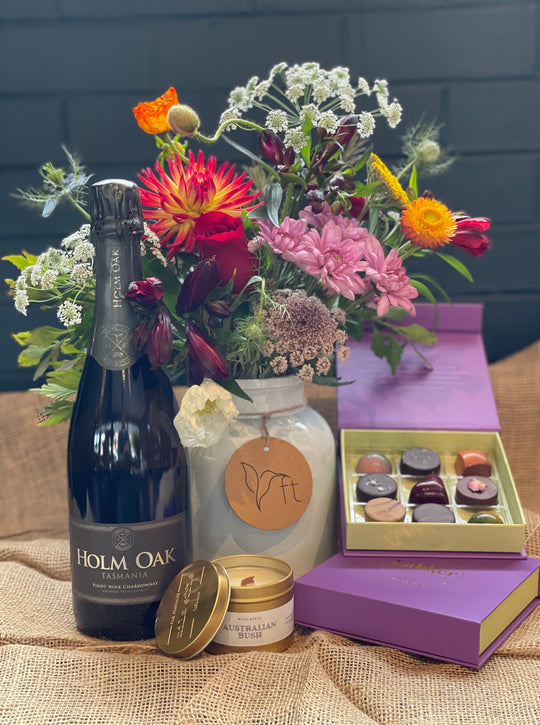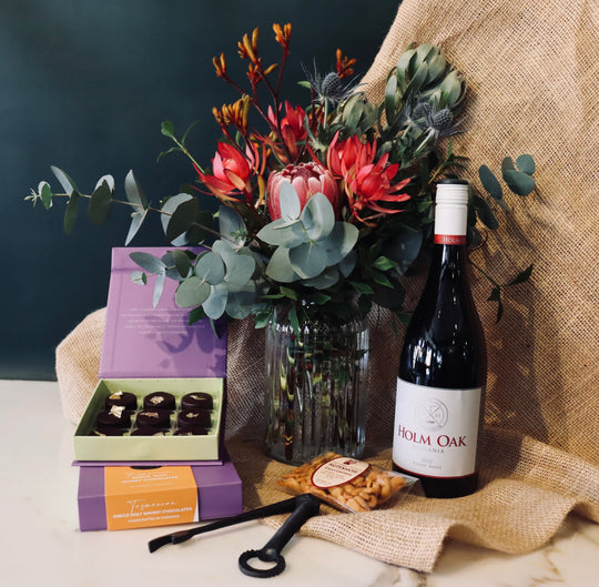 You can add a vase of fresh flowers by Florage Tasmania to be added to your hamper delivery.Β Unfortunately, we cannot ship flowers interstate.